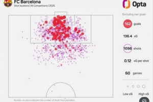 體育資訊12月31日訊 據(jù)數(shù)據(jù)網(wǎng)站OPTA統(tǒng)計,巴薩在2025年60場各項賽事共計打進169粒進球(包括烏龍球)。