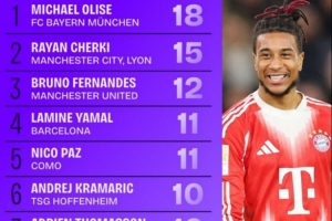體育資訊12月31日訊 數(shù)據(jù)網(wǎng)站Squawka盤點了2025年五大聯(lián)賽助攻榜,其中拜仁球員奧利塞居首,具體如下: