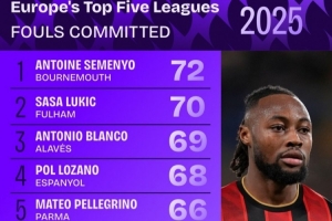 2025年五大聯(lián)賽犯規(guī)次數(shù)榜: