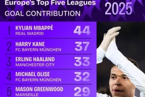 體育資訊1月1日訊 2025年已經(jīng)結(jié)束,squawka也統(tǒng)計(jì)了五大聯(lián)賽直接參與進(jìn)球榜,姆巴佩獨(dú)占鰲頭。