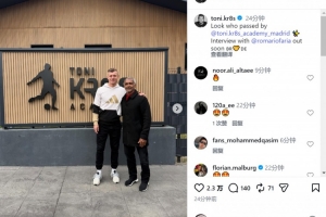 克羅斯社媒曬出合照,配文:“看看誰來青訓(xùn)學(xué)院了?與羅馬里奧的專訪即將發(fā)布?!?/p>