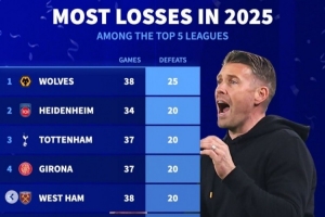體育資訊1月1日訊 2025年已經(jīng)結(jié)束,《轉(zhuǎn)會(huì)市場(chǎng)》也統(tǒng)計(jì)了本年度五大聯(lián)賽輸球場(chǎng)次最多情況,前五有3支英超球隊(duì)。