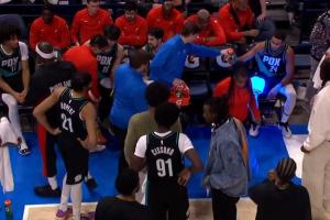 GIF-楊瀚森和阿夫迪亞主動溝通 不過后者似乎有些沒懂 喊了翻譯過來之后聽懂 隨后和楊瀚森碰拳