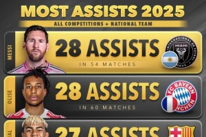以下是2025年年度助攻榜單(俱樂部+國家隊各項賽事):