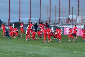 體育資訊1月3日訊 據(jù)記者Kerry Hau報道,穆西亞拉參加拜仁訓練之前的熱身。