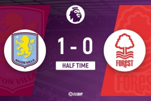 傷停補時1分鐘。上半場比賽結(jié)束,阿斯頓維拉1-0諾丁漢森林。