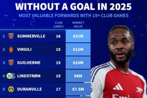 體育資訊1月4日訊 2025年已經(jīng)過去,多位知名前鋒一整年均未能取得進(jìn)球,《轉(zhuǎn)會(huì)市場》也統(tǒng)計(jì)了在俱樂部出場15+但0進(jìn)球的球員身價(jià)榜。