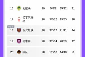 體育資訊1月4日訊 英超第20輪,狼隊(duì)3-0西漢姆聯(lián)取得聯(lián)賽首勝,20輪過(guò)后得到6分。目前狼隊(duì)距排名第17的森林12分,西漢姆聯(lián)沒(méi)能縮小差距,仍距森林4分。最新積分榜如下: