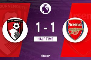 上半場傷停補(bǔ)時2分鐘,半場結(jié)束,阿森納暫1-1伯恩茅斯。