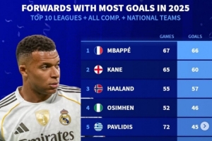 體育資訊1月4日訊 《轉(zhuǎn)會(huì)市場(chǎng)》統(tǒng)計(jì)了2025年前十聯(lián)賽前鋒的俱樂(lè)部+國(guó)家隊(duì)各項(xiàng)賽事進(jìn)球最多情況,姆巴佩居首。