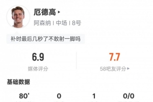 體育資訊1月4日訊 英超第20輪,阿森納客戰(zhàn)伯恩茅斯。厄德高首發(fā)出戰(zhàn),送出1次助攻,1次關(guān)鍵傳球,還有3次搶斷,評(píng)分6.9。