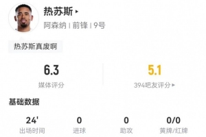 體育資訊1月4日訊 阿森納在本輪英超3-2擊敗伯恩茅斯,熱蘇斯本場數(shù)據(jù)如下:
