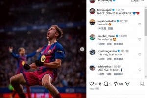 此役費(fèi)爾明替補(bǔ)出場(chǎng),送出2記助攻,幫助巴薩取勝,賽后他在社交媒體上曬出慶祝的照片,配文:“巴塞羅那是紅藍(lán)色的 ????”