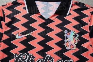另一個突出的細(xì)節(jié)在于廣告贊助商區(qū)域,傳統(tǒng)的贊助商標(biāo)志被替換為手寫體風(fēng)格、“切爾西”字樣的單詞,經(jīng)典的流暢筆觸進(jìn)一步強化了球衣的復(fù)古身份。