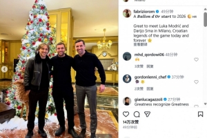 羅馬諾配文寫道:“2026年伊始與金球獎先生共度。很高興與莫德里奇、斯?fàn)柤{在米蘭相遇,兩位代表著克羅地亞足球的現(xiàn)在和永恒?!?/p>