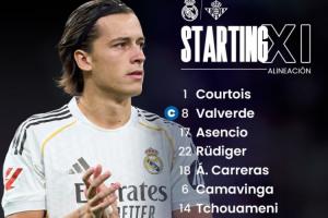 皇馬首發(fā):1-庫(kù)爾圖瓦、8-巴爾韋德、17-勞爾·阿森西奧、22-呂迪格、18-卡雷拉斯、6-卡馬文加、14-瓊阿梅尼、5-貝林厄姆、11-羅德里戈、7-維尼修斯、16-貢薩洛·加西亞