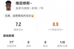 體育資訊1月5日訊 皇馬在本輪西甲對(duì)陣貝蒂斯,維尼修斯本場(chǎng)數(shù)據(jù)如下: