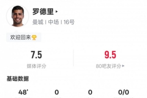 體育資訊1月5日訊 2025-26賽季英超聯(lián)賽第20輪,曼城主場迎戰(zhàn)切爾西。羅德里首發(fā)出戰(zhàn),上半場送出3次關(guān)鍵傳球,4次搶斷,6次地面對抗5次成功,評分7.5。