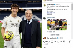 皇馬主席弗洛倫蒂諾賽后與貢薩洛·加西亞合影,祝賀后者上演帽子戲法,皇馬官方社媒曬出照片。