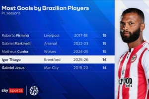 體育資訊1月5日訊 英超第20輪比賽,伊戈爾·蒂亞戈上演帽子戲法,幫助布倫特福德客場4-2擊敗埃弗頓。天空體育指出,伊戈爾·蒂亞戈本賽季英超打進(jìn)14球,有望打破巴西球員單賽季英超進(jìn)球紀(jì)錄。