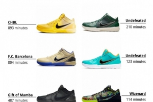 排名第2的是Kobe 4 Protro Barcelona(巴塞羅那),上腳時(shí)長804分鐘。