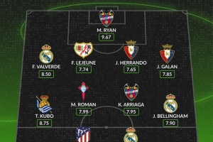 后衛(wèi):費德里科·巴爾韋德(皇家馬德里,8.50分)、弗洛里安·勒熱納(巴列卡諾,7.74分)、豪爾赫·埃蘭多(奧薩蘇納,7.65分)、哈維·加蘭(奧薩蘇納,7.85分)