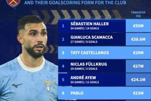 德轉(zhuǎn)列西漢姆前鋒引援榜(及效力時期進球數(shù)據(jù)):歐元