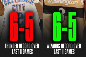 雷霆目前30勝6負,排名西部第一;奇才9勝25負,排名東部第十四。