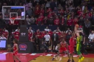 距離第四節(jié)結(jié)束還剩8秒時(shí),俄勒岡依然落后3分,邊線發(fā)球后,林葳拿球無視對(duì)手防守,強(qiáng)行干拔命中絕平三分!