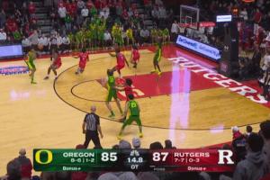 羅格斯大學(xué)兩罰一中之后,落后三分的俄勒岡最后一攻,林葳運過來,還是給了比特,比特再傳林葳,林葳再傳,時間不夠了…