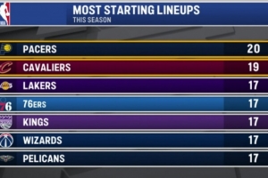 體育資訊1月7日訊 今日,騎士比賽轉(zhuǎn)播商曬出了本賽季至今使用最多套不同首發(fā)陣容的球隊(duì)排名: