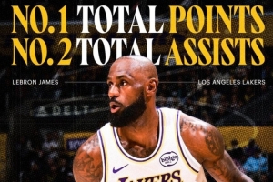 今天,湖人官方曬出了專屬海報(bào),并寫道:“NBA歷史得分王現(xiàn)在還位居總助攻榜第二,勒布朗是獨(dú)一無二的?!?/p>