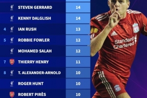 以下為阿森納、利物浦交鋒參與進(jìn)球數(shù)排行: