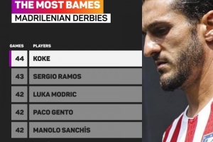 科克超越拉莫斯成為馬德里德比出場(chǎng)最多球員,位居兩人身后的是莫德里奇、亨托以及桑奇斯的42場(chǎng)。