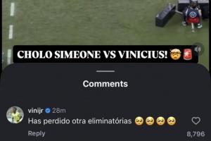 賽后名記羅馬諾在個(gè)人社媒賬號轉(zhuǎn)發(fā)了這期沖突的現(xiàn)場視頻,而維尼修斯本人也現(xiàn)身評論區(qū),評論道:“(西蒙尼)又輸?shù)粢粓鎏蕴??!?/strong>
