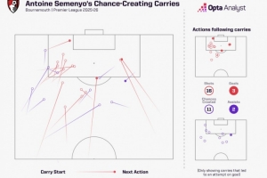 據(jù)Opta統(tǒng)計(jì),塞梅尼奧本賽季英超帶球射門16次、創(chuàng)造11次機(jī)會(huì),帶球后打進(jìn)3球、助攻2次,展現(xiàn)了不俗的突擊能力。