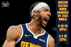 掘金官方今日曬出了一組數(shù)據(jù),昨天凱爾特人球員面對納吉防守時,運動戰(zhàn)20中5,三分6中2。