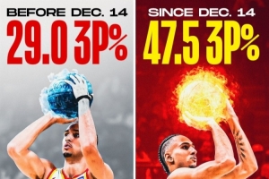 據(jù)統(tǒng)計,在賽季開始至北京時間12月15日這段時間,他的三分命中率僅為29%。而在那之后的12月16日至今,他的三分命中率達到47.5%。