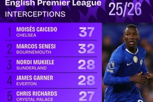 體育資訊1月10日訊 squawka統(tǒng)計了本賽季英超成功攔截情況,凱塞多力壓塞內(nèi)西居首。