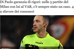 體育資訊1月10日訊 據(jù)米蘭新聞網(wǎng)報道稱,迪保羅本賽季5次作為VAR裁判執(zhí)法米蘭的比賽,吹了3個點球給對面,但3個都沒有罰進。