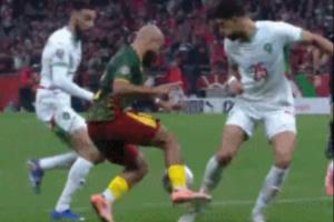 比賽第68分鐘,姆伯莫帶球突入禁區(qū)后痛苦倒地,裁判沒(méi)有判給喀麥隆隊(duì)點(diǎn)球,回放來(lái)看,摩洛哥球員與姆伯莫的右腿有一個(gè)接觸。