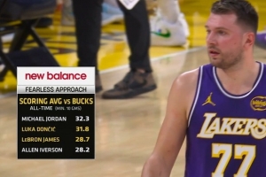 (對陣雄鹿場均得分榜,喬丹32.3分最高,東契奇31.8分第二,詹姆斯28.7分第三,艾弗森28.2分第四