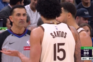 GIF-桑托斯與威少籃板卡位時(shí)被吹犯規(guī),勇士挑戰(zhàn)成功;但桑托斯打到威少臉部,被補(bǔ)吹T