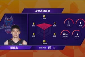 ??1月9日,常規(guī)賽第12輪,山東高速客場87-85戰(zhàn)勝北京北汽,收獲5連勝。本場比賽山東高速隊高詩巖因傷缺陣,后衛(wèi)線上珀賽爾和謝智杰站了出來,珀賽爾在最后時刻完成絕殺,謝智杰登場29分11秒,貢獻15分7籃板6助攻。這是謝智杰職業(yè)生涯首次打出15+5+5的表現。