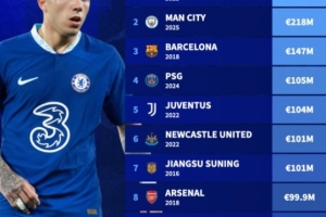 以下為足壇俱樂部單個冬窗引援花費排行榜: