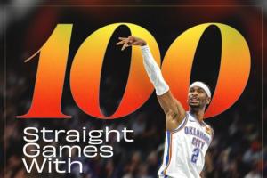 這也是亞歷山大連續(xù)100場(chǎng)得分上雙,繼續(xù)追逐NBA歷史第一的張伯倫(126)。