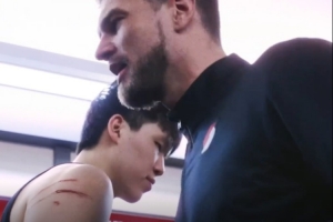 賽后更衣室內,球隊臨時主帥斯普利特滿臉笑容,里斯獲得球隊本場最佳防守球員,與斯普利特擁抱時,楊瀚森的手臂抓傷清晰可見。
