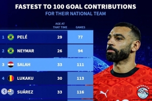 體育資訊1月11日訊 埃及在非洲杯八強(qiáng)戰(zhàn)3-2淘汰科特迪瓦,薩拉赫傳射建功,也達(dá)成了國家隊直接參與100球里程碑?!掇D(zhuǎn)會市場》統(tǒng)計顯示他也是歷史第三快達(dá)成國家隊直接參與100球的球員。