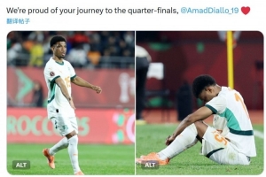 曼聯(lián)官方社媒曬出阿瑪?shù)略趪?guó)家隊(duì)的照片,并寫道:“向阿瑪?shù)轮乱晕繂?,他所在的球?duì)在周六的非洲杯比賽中出局?!?/p>