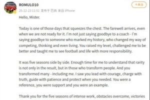 今天真的是讓我感到難過,離別總是來得那么突然,讓人措手不及。我不僅僅是在向一位主教練告別,更是在向一位給我留下深刻印記的人告別,他改變了我的比賽方式、思維模式乃至日常生活。您提升了我的競技水平,激勵(lì)我變得更好,并教會(huì)我?guī)е嘭?zé)任感看待足球和生活。